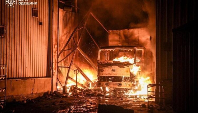 По данным ГСЧС, враг ночью атаковал Одессу ударными дронами. В результате попадания начался пожар на складе, поврежден грузовой автомобиль. В тушении пожара принимали участие более 40 спасателей ГСЧС, пожарного подразделения Национальной гвардии Украины и добровольцев. Пожар оперативно локализовали и ликвидировали.